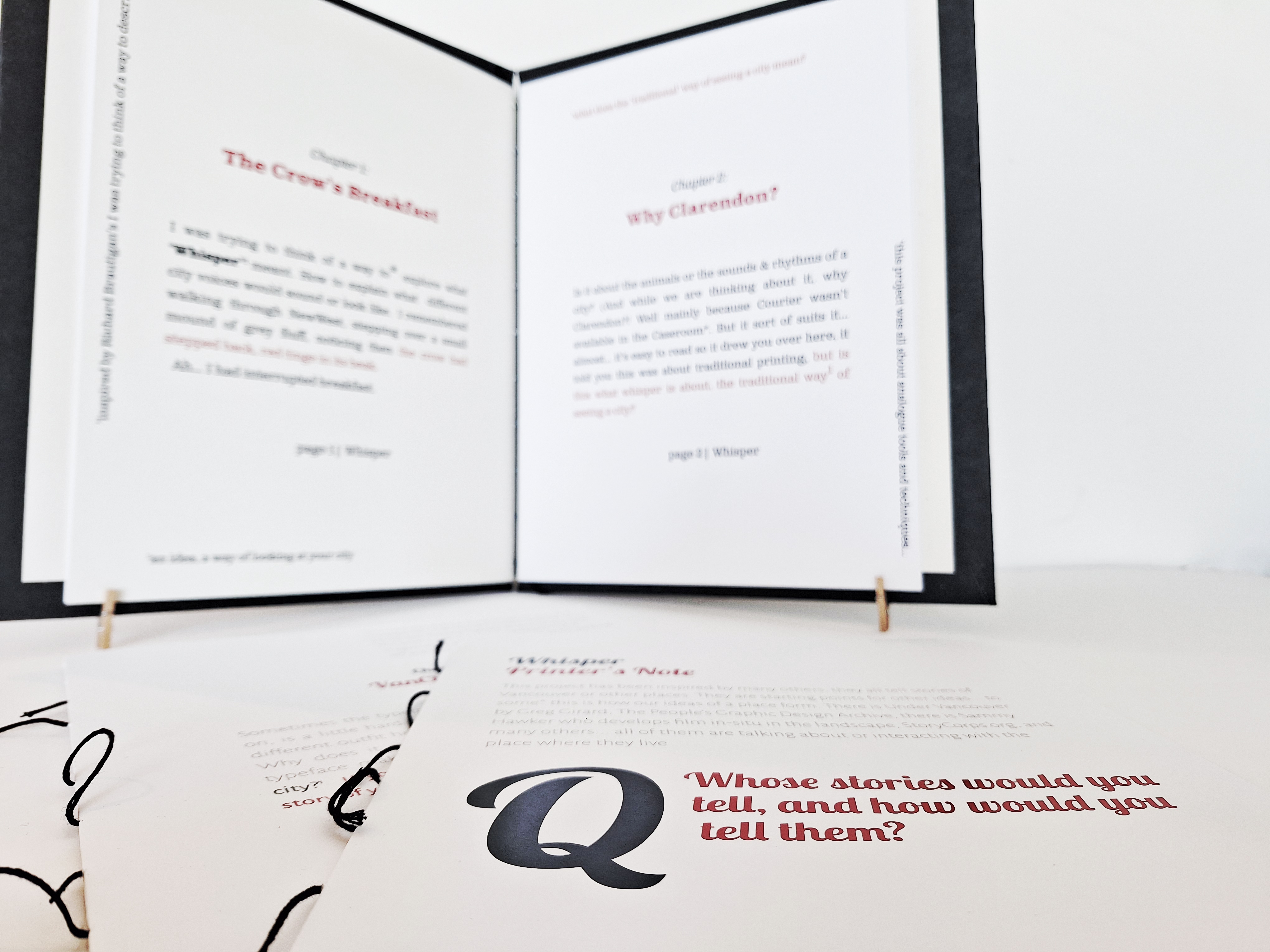 Concept: This design, for the Emily Carr Master's Grad Show, centred around displaying the process of design, and typography’s role within it, in order to explore ideas around whose design stories are published. This was articulated through material choice and transparent design processes on one side, and experimental publications on the other. Giant punctuation framed the visual story, with focussed narrative points along the way to draw the reader in. Care was taken over each exhibiting decision to ensure that process and material cues were given to the audience member, eschewing traditional approaches which view the object as the focus—not how or why it was made.